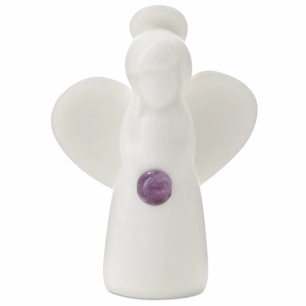 - Miniature ceramic angel figurine by artist Joanne Eschrich features amethyst gemstone accent.