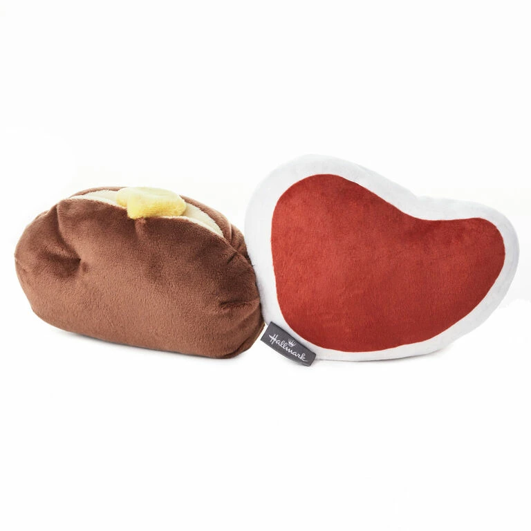 - Set of two steak and potato stuffed toys are made of soft plush fabric and feature embedded magnets for connecting to each other.