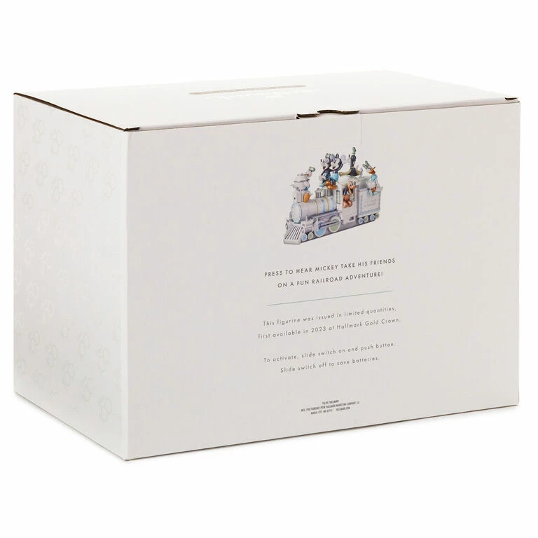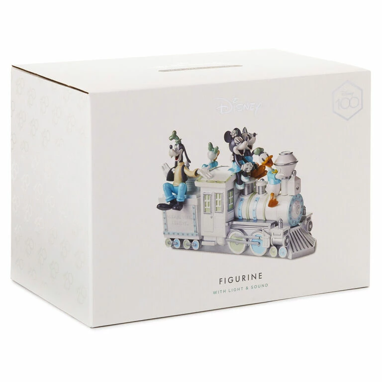 Climb aboard for the ultimate Disney celebration! This year-dated, special edition train figurine shimmers with pearlescent and iridescent finishes in recognition of Disney’s 100th anniversary. Press the button to see the train light up and hear Mickey Mouse take his friends on a fun railroad adventure. The collectible piece makes a charming gift for Disney fans of all ages.